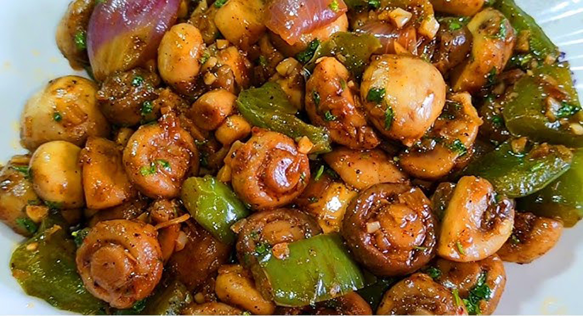 - অন্য একটি প্যানে সামান্য মাখন দিয়ে পেঁয়াজ কুচি বাদামি করে ভাজুন এবং তাতে কিছুটা মাশরুম এবং গোলমরিচের গুঁড়া দিয়ে রান্না করুন ১ মিনিট।